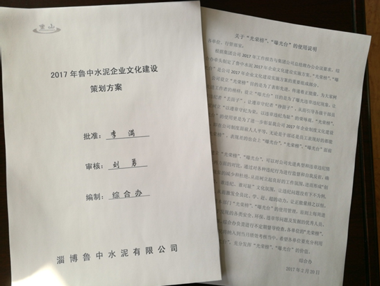 根據(jù)集團(tuán)公司2017年工作報(bào)告與集團(tuán)公司總經(jīng)理辦公會(huì)議要求,魯中水泥綜合辦組織制定了2017年魯中水泥企業(yè)文化建設(shè)實(shí)施方案。“光榮榜”、“曝光臺(tái)”作為2017年魯中水泥企業(yè)文化建設(shè)實(shí)施方案的重要組成部分,經(jīng)過(guò)積極準(zhǔn)備、籌劃,已于2017年2月20日在公司各部門(mén)懸掛到位,投入使用。