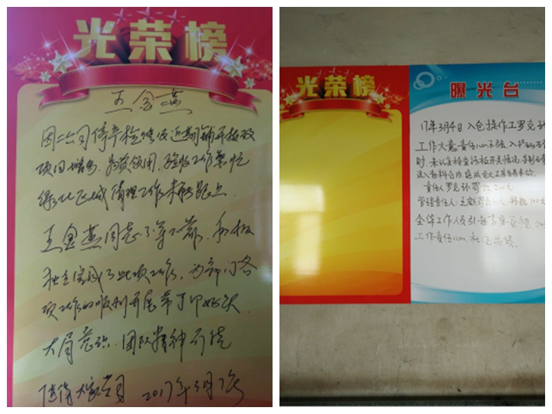 為響應2017年工作報告中加強企業(yè)文化建設的號召,魯中水泥積極謀劃,在廣泛征求干部員工意見的基礎上,設立了“光榮榜”和“曝光臺”宣傳平臺,懸掛到各部門車間。“光榮榜”與“曝光臺”緊緊挨著,日常工作中的亮點與不足都讓干部職工一目了然。