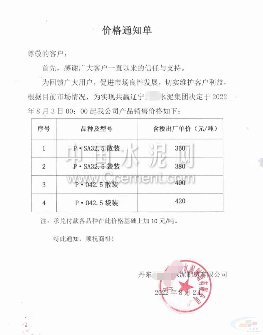 據(jù)市場反饋,8月1日起,遼寧省沈陽、遼陽地區(qū)水泥企業(yè)通知上調水泥價格60-80元/噸。