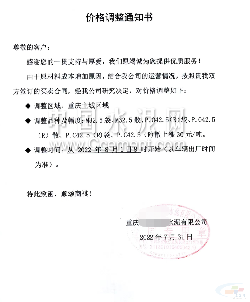 為提升盈利,8月1日起重慶地區(qū)一些廠家通知上調水泥價格30-50元/噸左右,主流漲幅30元/噸。目前廠家已發(fā)布調漲通知,具體落實情況有待觀察。