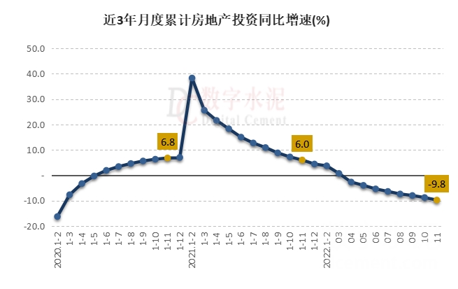 宏觀層面,我國持續(xù)推進穩(wěn)經濟政策措施落地見效,但受國內疫情沖擊等因素影響,固定資產投資增速有所回落。各地積極推進重大項目建設,適度超前開展基礎設施投資,支撐基礎設施投資連續(xù)加快,其中,水利管理業(yè)投資同比快速增長,道路運輸業(yè)投資增速有所回落,鐵路運輸業(yè)投資轉為正增長。房地產投資方面,盡管政策利好不斷,但從市場表現(xiàn)看,“探底”仍在持續(xù)。1-11月,全國月度累計房地產開發(fā)投資同比降幅繼續(xù)擴大,房地產開發(fā)企業(yè)房屋施工面積、新開工面積和土地購置面積同比降幅均有所擴大。