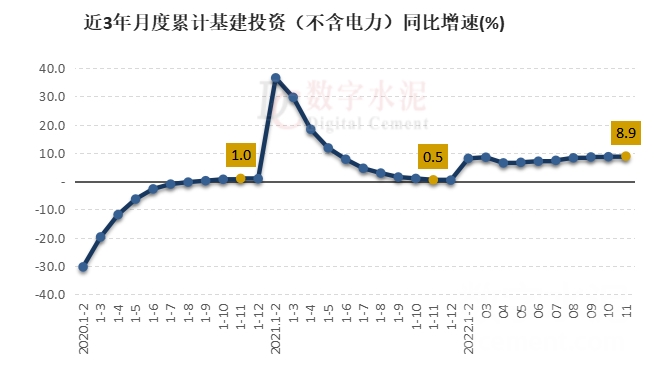 1-11月,全國基礎設施投資(不含電力)同比增長8.9%,增速較1-10月上升0.2個百分點,高于去年同期8.4個百分點。其中,水利管理業(yè)投資同比增長14.1%,道路運輸業(yè)投資增長2.3%,鐵路運輸業(yè)投資增長2.1%。