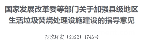 11月28日,國家發(fā)展改革委、住房和城鄉(xiāng)建設(shè)部、生態(tài)環(huán)境部、財政部、中國人民銀行五部門聯(lián)合印發(fā)了《國家發(fā)展改革委關(guān)于加強縣級地區(qū)生活垃圾焚燒處理設(shè)施建設(shè)的指導(dǎo)意見》。