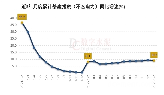 1-2月,全國基礎(chǔ)設(shè)施投資(不含電力)同比增長9%,增速高于去年同期0.9個百分點,較2022年全年下降0.4個百分點。其中,水利管理業(yè)投資同比增長3.0%,道路運輸業(yè)投資同比增長5.9%,鐵路運輸業(yè)投資同比增長17.8%。