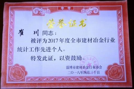 日前,魯中水泥運營部經理崔川榮獲“2017年度全市建材冶金行業(yè)綜合統(tǒng)計工作先進工作者”榮譽稱號。