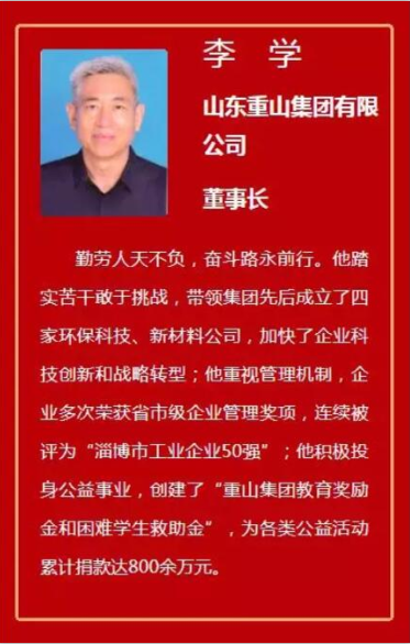 在改革開放40周年之際,為貫徹落實中共中央、國務(wù)院《關(guān)于營造企業(yè)家健康成長環(huán)境弘揚優(yōu)秀企業(yè)家精神更好發(fā)揮企業(yè)家作用的意見》,淄博市企業(yè)聯(lián)合會、市企業(yè)家協(xié)會組織開展淄博市優(yōu)秀企業(yè)家評選活動,按照“創(chuàng)新力、影響力、貢獻力”原則,綜合考量企業(yè)家在區(qū)域發(fā)展、行業(yè)領(lǐng)軍、社會責任等方面的貢獻,經(jīng)過材料審核、專家實地考察、專家組討論打分、評審等嚴格的程序之后,于近日公布了名單。重山集團董事長李學(xué)榜上有名,彰顯了重山集團在經(jīng)濟社會發(fā)展中的風采,體現(xiàn)了李學(xué)董事長誠信、務(wù)實、創(chuàng)新的優(yōu)秀企業(yè)家精神。
