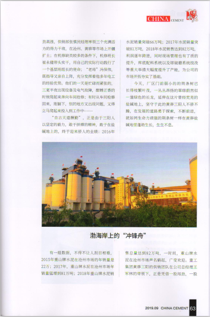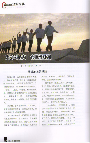近日,《中國水泥》雜志2019年第9期刊發(fā)了《凝心聚力 創(chuàng)新圖強》一文。文章生動再現(xiàn)了黃驊三陽干部員工在這片鹽堿地上奮斗身影和工作風彩、團隊風彩,進一步宣揚了黃驊三陽在致良知思想引領下的精神風貌和工作業(yè)績,也為提升企業(yè)品牌形象發(fā)揮了更好的作用。