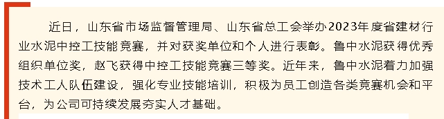 【榮譽(yù)】魯中水泥趙飛榮獲省建材行業(yè)水泥中控工技能競(jìng)賽三等獎(jiǎng)