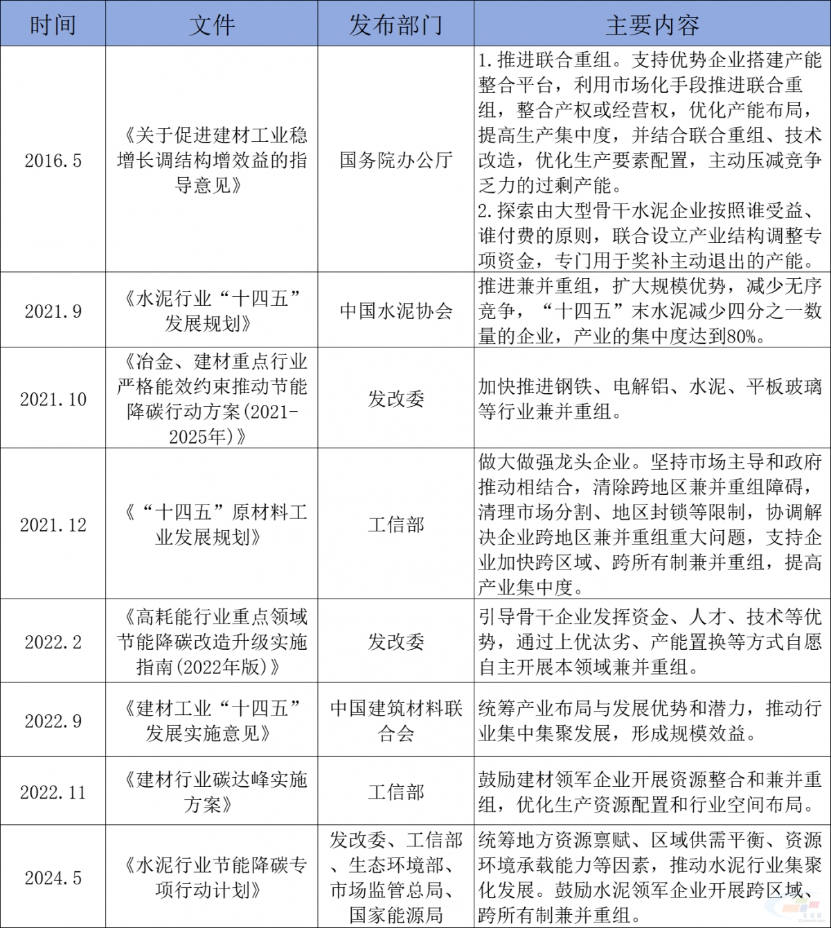 盡管挑戰(zhàn)重重,但越來越多的水泥企業(yè)認為,推進并購重組,不斷提升集中度儼然成為行業(yè)走出當(dāng)前困境的重要舉措。近年出臺的各項政策文件也反復(fù)強調(diào),要鼓勵水泥領(lǐng)軍企業(yè)開展跨區(qū)域、跨所有制兼并重組。