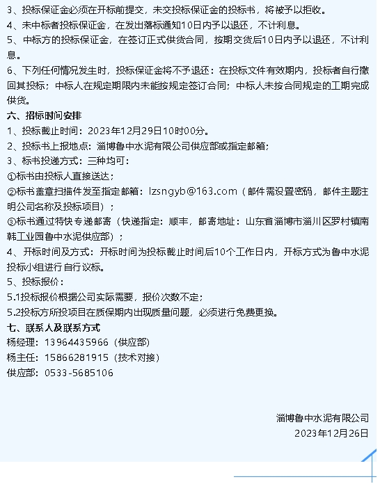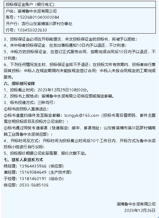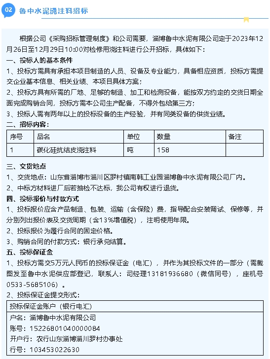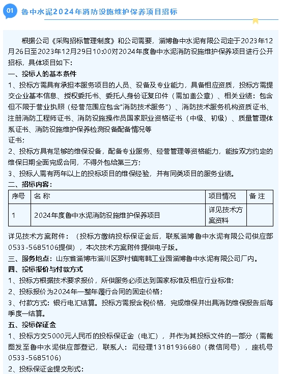 【招標(biāo)公告】魯中水泥2024年消防設(shè)施維護(hù)保養(yǎng)項(xiàng)目、澆注料招標(biāo)