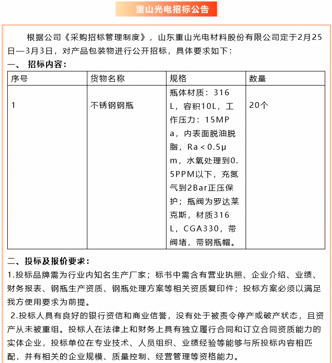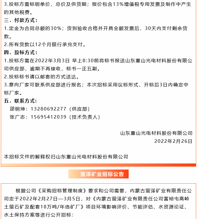 【招標(biāo)公告】重山光電、螢澤礦業(yè)