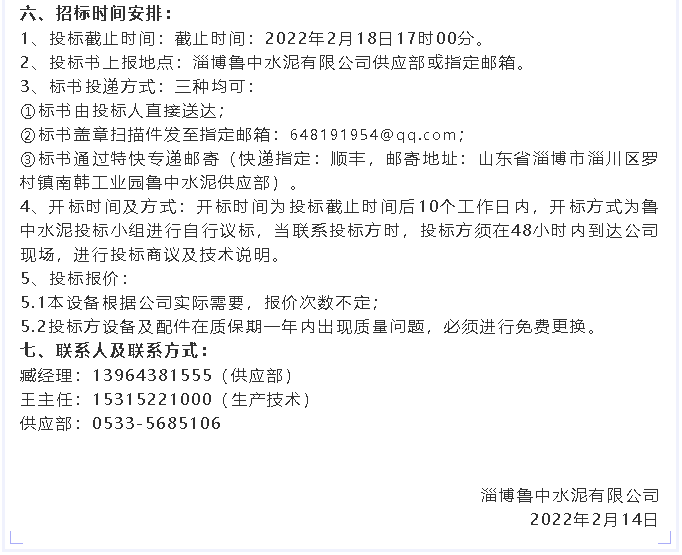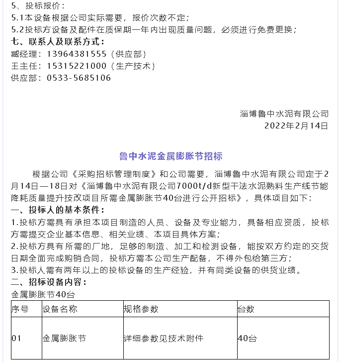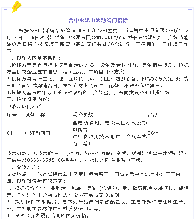 【招標(biāo)公告】魯中水泥電液動(dòng)閥門(mén)、金屬膨脹節(jié)招標(biāo)