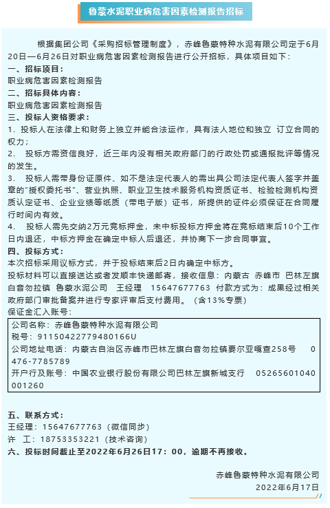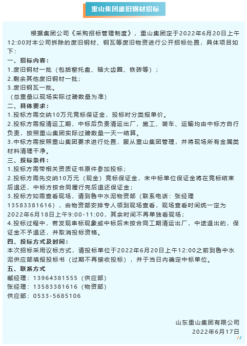 【招標公告】重山集團廢舊鋼材招標、魯蒙水泥職業(yè)病危害因素檢測報告招標