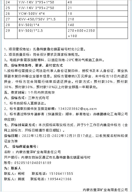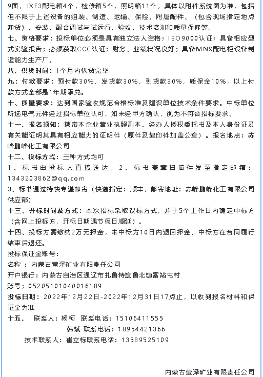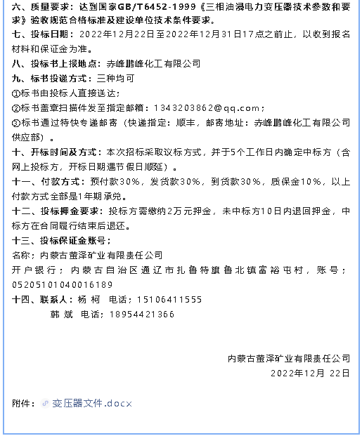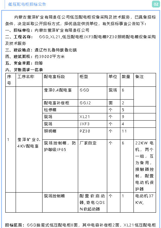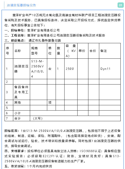 【招標公告】螢澤礦業(yè)油浸變壓器、低壓配電柜、電纜材料招標公告