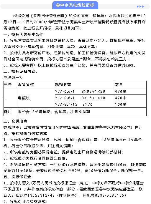 【招標公告】魯中水泥鐵礦粉、電纜線招標