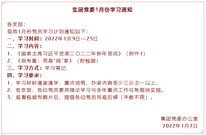 【通知】集團(tuán)黨委1月份學(xué)習(xí)通知